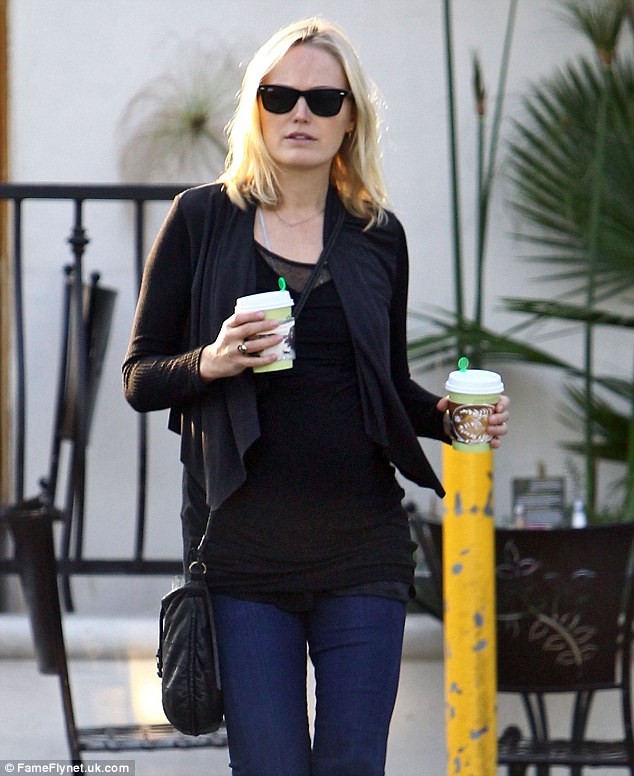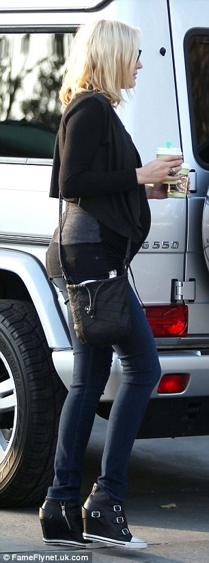 Hasn't Malin Akerman maintained a skinny pregnancy? Here she is on a coffee run in her ultra skinny jeans, sheer black top and cropped black cardigan and those high top designer sneakers that I cannot warm to.